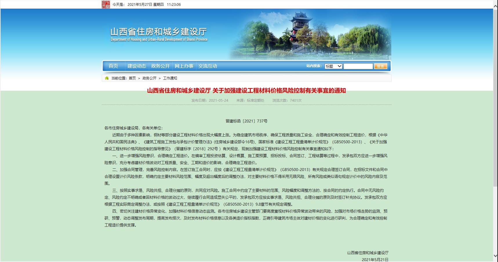山西省住房和城鄉(xiāng)建設(shè)廳 關(guān)于加強(qiáng)建設(shè)工程材料價(jià)格風(fēng)險(xiǎn)控制有關(guān)事宜的通知